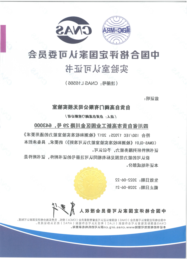 国家实验室认可是对检测/校准实验室和检验机构有能力完成特定任务作出正式承认的程序,是对检测/校准实验室进行类似于应用在生产和服务的ISO9001认证的一种评审,但要求更为严格,由中国合格评定国家认可委员会组织进行。通过认可的实验室出具的检测、检验、校准报告/证书可以加盖(CNAS)和ILAC的印章,所出具的数据国际互认。 2022-6-22自高成功取得CNAS认可认证证书